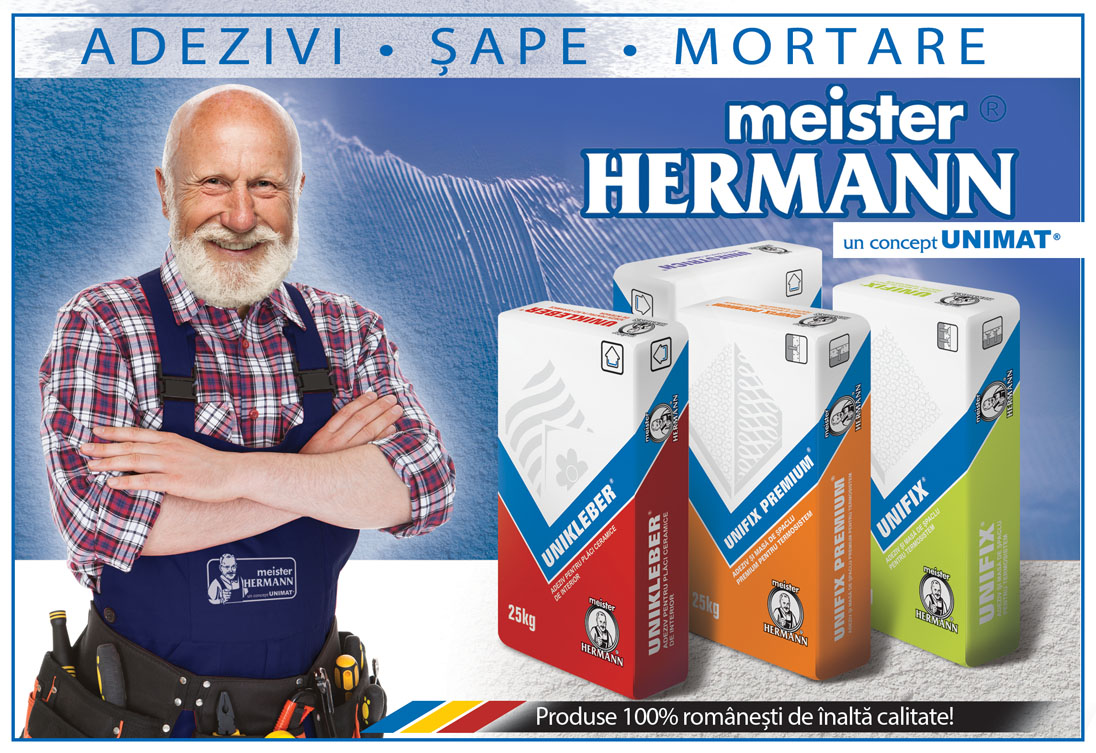 Firma UNIMAT a lansat în anul 2015 în magazinele sale, sub un brand propriu, produsele din gama de adezivi, tencuieli, mortare şi şape: Meister Hermann! Produse în Romania şi certificate UE, după reţete testate...