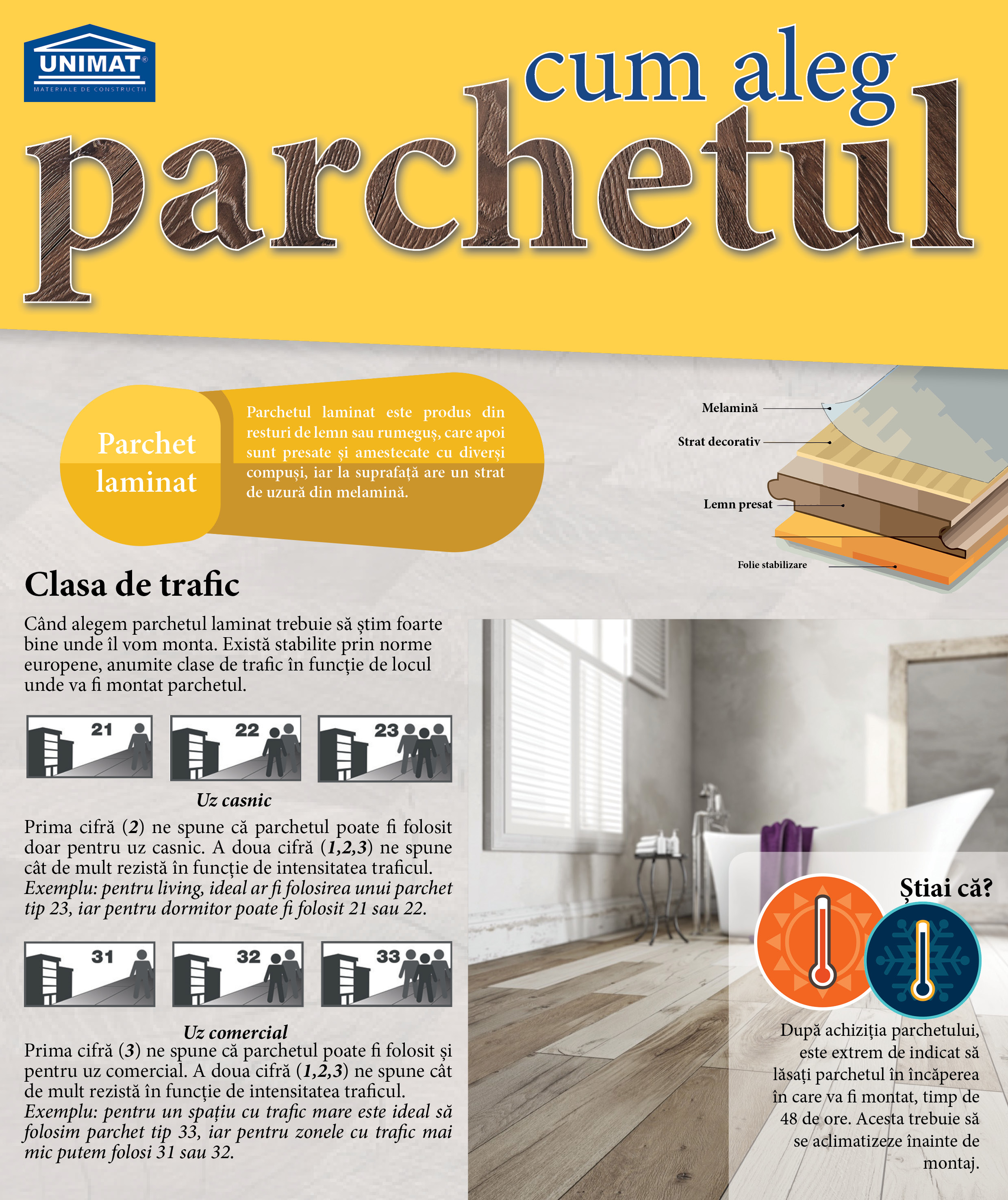 Parchetul laminat este produs din resturi de lemn sau rumegus, care apoi sunt presate si amestecate cu diversi compusi, iar la suprafata are un strat de uzura din melamina. Cand alegem parchetul laminat trebuie...